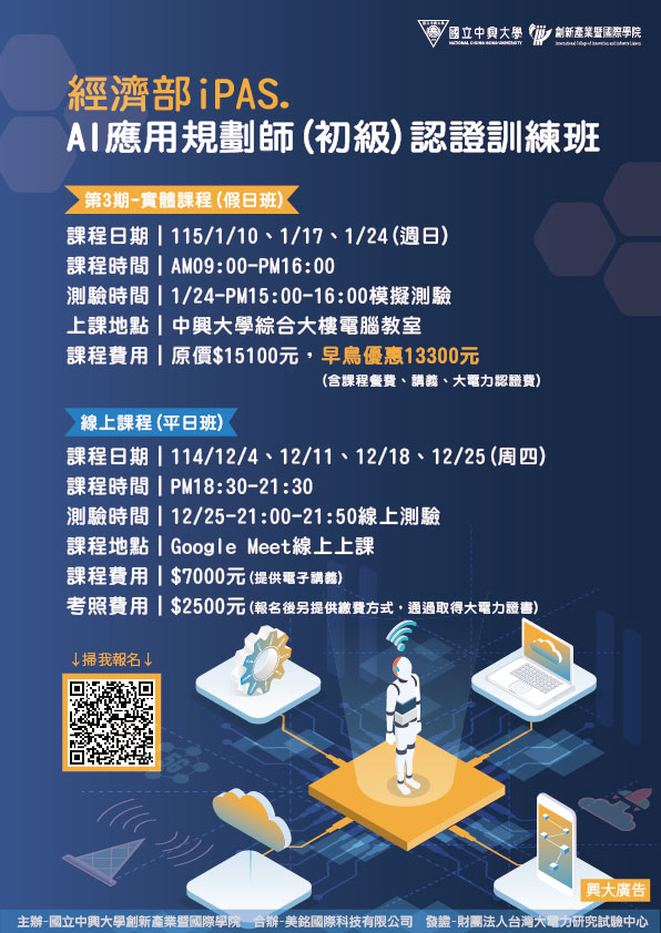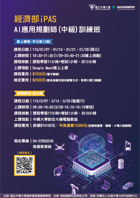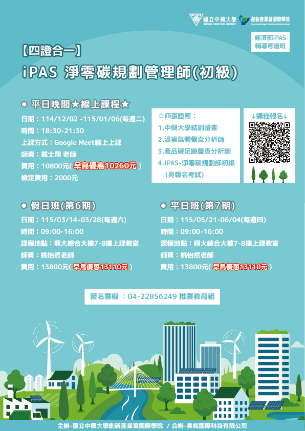 【教學組公告】國立中興大學辦理「四證合一-經濟部 iPAS 淨零碳規劃管理師(初級)輔導考證班、經濟部iPAS-AI應用規劃師(初級、中級) 輔導訓練班」招生訊息
