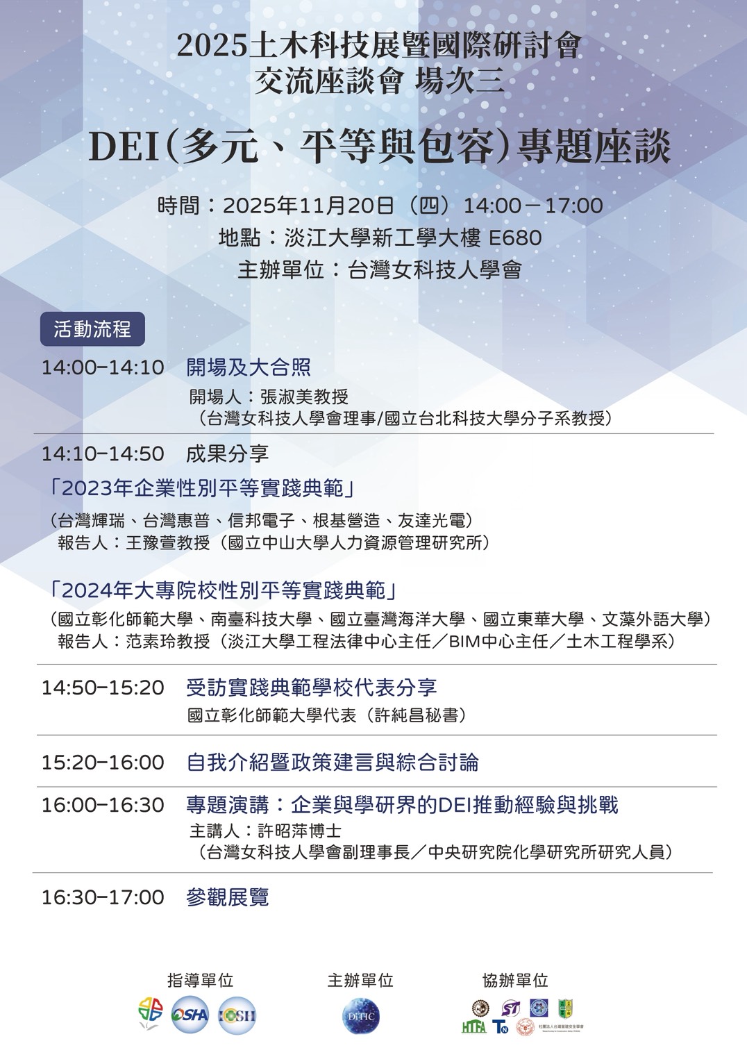 一、旨揭論壇係該中心舉辦之「土木科技展暨國際研討會」場次3活動,該座談會由台灣女科技人學會主辦,活動聚焦多元、平等與包容(DEI)之企業實務、大專校院推動成果、跨領域交流及展覽導覽。