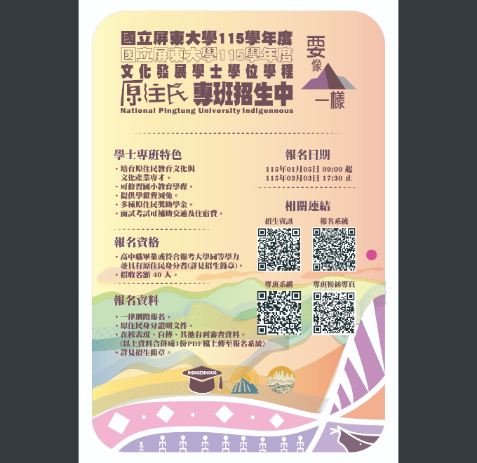 【註冊組公告】🦉國立屏東大學115學年度文化發展學士學位學程原住民專班🦉