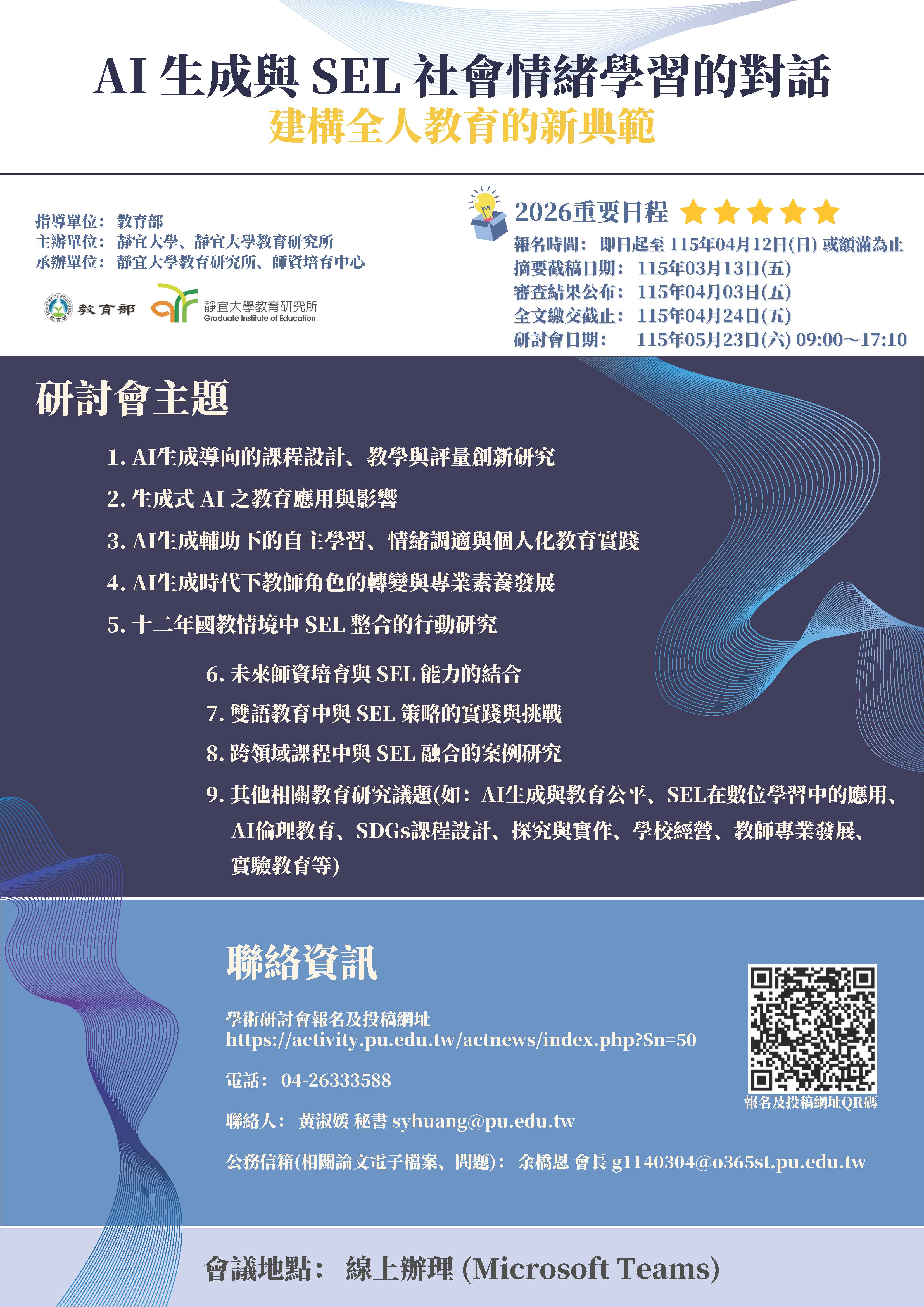 【教學組公告】靜宜大學舉辦「AI生成與SEL社會情緒學習的對話:建構全人教育的新典範」學術研討會徵稿相關資訊